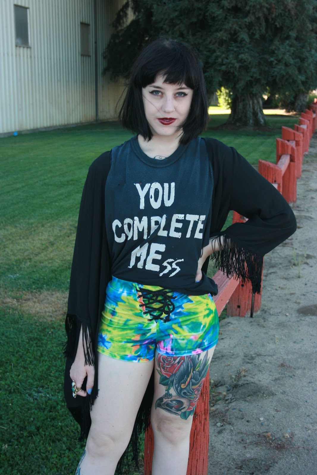 Tank; UNIF | Shorts; Bad Vibes via Tunnel Vision | Kimono; The Laundry Room | Ring; Vanessa Mooney | Shoes; Urban Outfitters | Lipstick; Revlon "Black Cherry"
